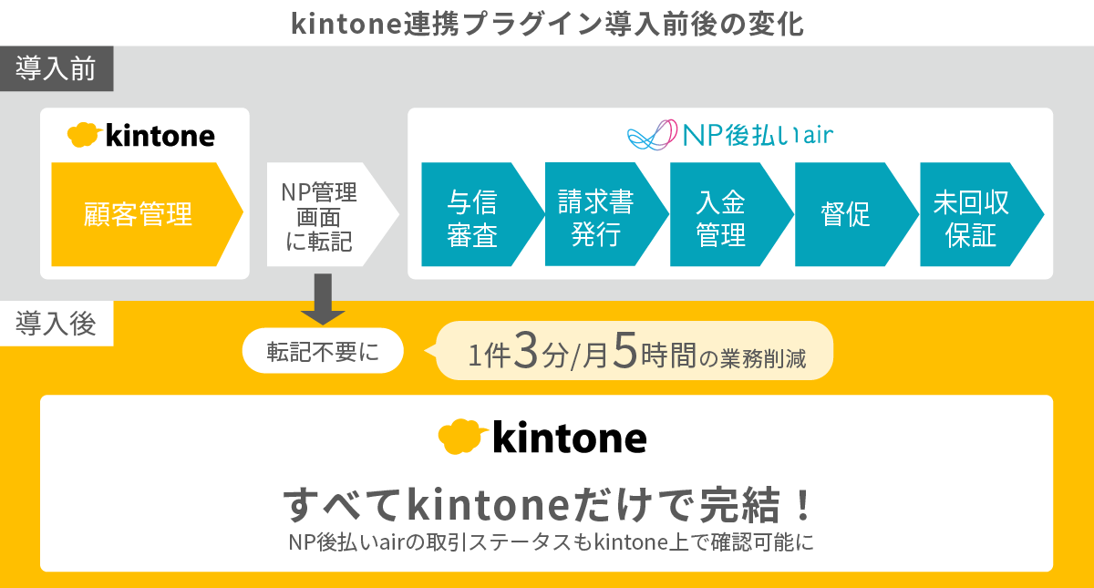 これまでは、手書きの案件シートやExcelなど複数のツールで案件を管理しており、情報管理が煩雑になっていました。そこでkintoneを導入し全ての情報を一元管理することで業務効率化を進めていました。その後「NP後払いair」を導入した際に、一部情報をkintoneから「NP後払いair」に転記する手間が発生してしまっていました。転記の手間をなくし、全ての情報をkintone で一元化するため「NP後払いair」のkintone連携プラグインを導入しました。