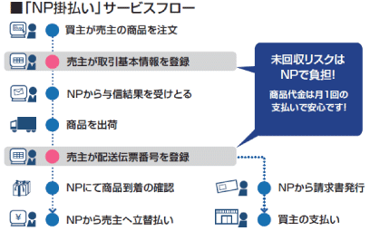 「NP掛払い」は、企業間におけるネット販売などの30万円までの小口取引の掛払い決済を代行し、売主に代金を立て替えて支払うサービスです。卸業者やメーカーが「NP掛払い」を導入することで、企業与信ができないため新規取引先を増やせない、掛売りをしているが回収・督促業務が煩雑になっている、などの問題を解消し、安心して掛売りが可能になります。