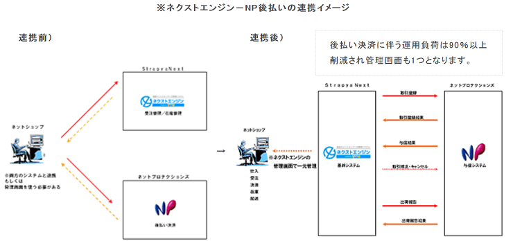 従来は、各ネットショップの基幹システムとネットプロテクションズの与信システムを連携することでNP後払いの自動化が可能となりましたが、StrapyaNextのネクストエンジンとネットプロテクションズの与信システムを直接連携させることで、ネクストエンジンを利用する4,000サイトの全てのネットショップがNP後払いを利用できるようになります。