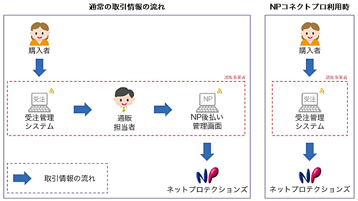 今回の自動連携により、受注管理システム「easyECS」および「easyECS」を含む受注・在庫・商品のトータル管理パッケージシステム「サバスタ」を利用する通販事業者が「NP後払い」を利用する場合、「NP後払い」の利用に必要なデータ(取引情報、与信結果、配送伝票番号など)の送受信を自動化する有料オプションサービス「NPコネクトプロ」の利用が無料となるほか、「NP後払い」と「easyECS」を連携する際に発生するシステム開発費用も、一切かからずに利用できるようになります。これにより、「easyECS」を利用する通販事業者は無償で「NP後払い」の利用における業務効率を大幅に向上させることができます。なお、通常「NPコネクトプロ」の利用には、初期導入費20万円(税抜)ならびに月額運用費2万円(税抜)が発生します。